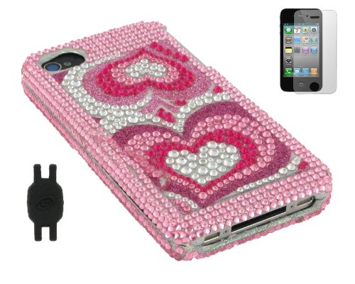 Pink Heart Design Full Rhinestones Snap On Hard Case with Screen Protector for Apple iPhone 4 4th Generation with Silicone Shoe Pouch for Nike+ iPod Sensor, Fits AT&T and Verizon Feature